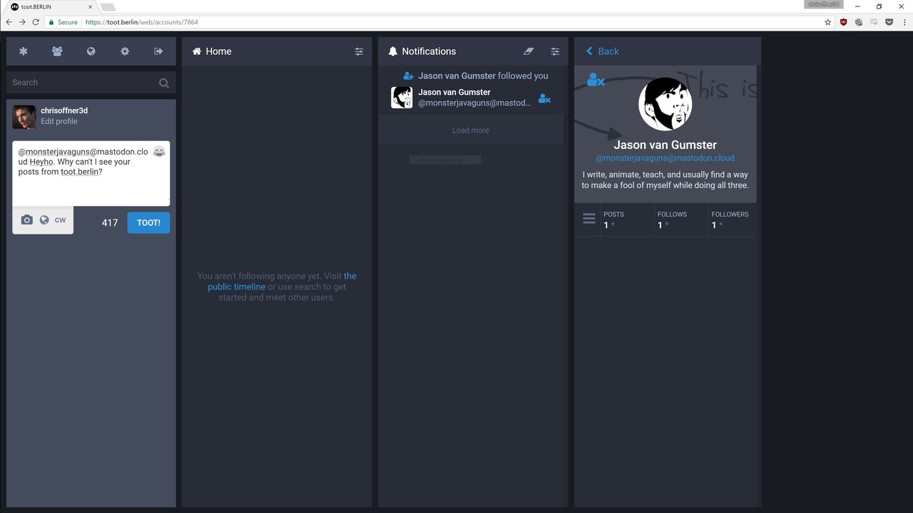 @monsterjavaguns Heyho. Why can't I see your posts from toot.berlin? https://toot.berlin/media/arVO-eBsLkahsQB5nzY
